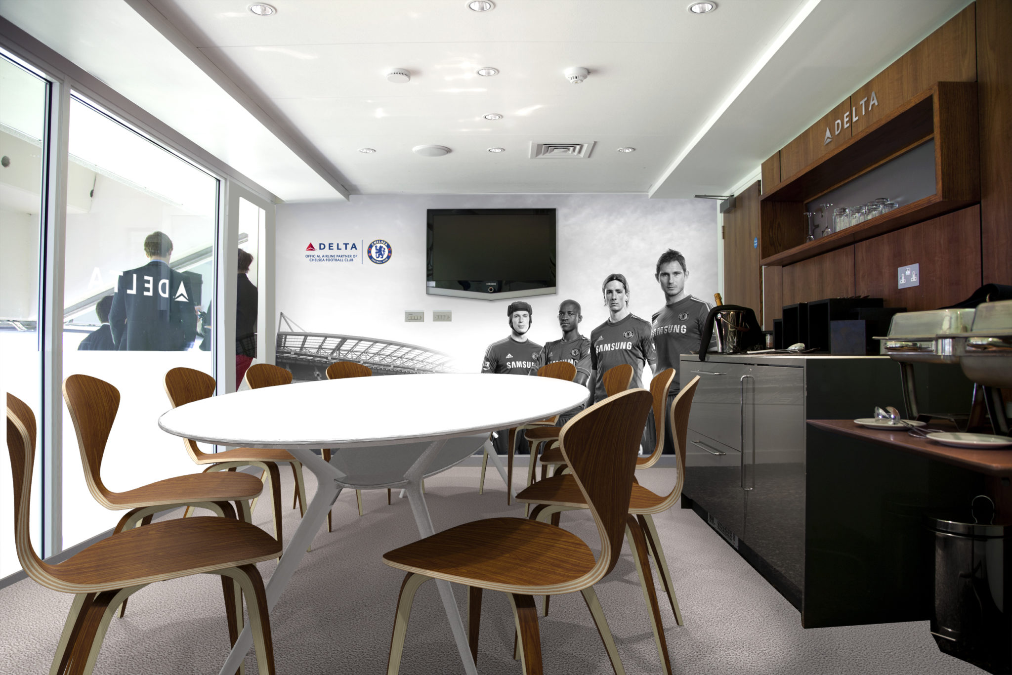 This time a high quality refurbishment of the Delta Airways Executive Box within Chelsea Football Club. The project consisted of high quality joinery fabrication and installation, wall panelling, floor finishes and soft furnishes. Completed on time in 1 week and to budget, Cumberland definitely kept up their winning streak. Refurbished with the highest attention to detail, the Executive Box is a fantastic space to relax and enjoy all the action of the games.